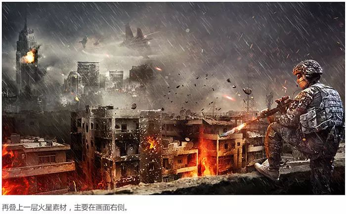 1、将火焰素材置于两栋楼的交界处,通过“滤色”模式,直接把火焰素材中黑色部分过渡掉。这里用到的几个火焰素材区别还是比较明显的。