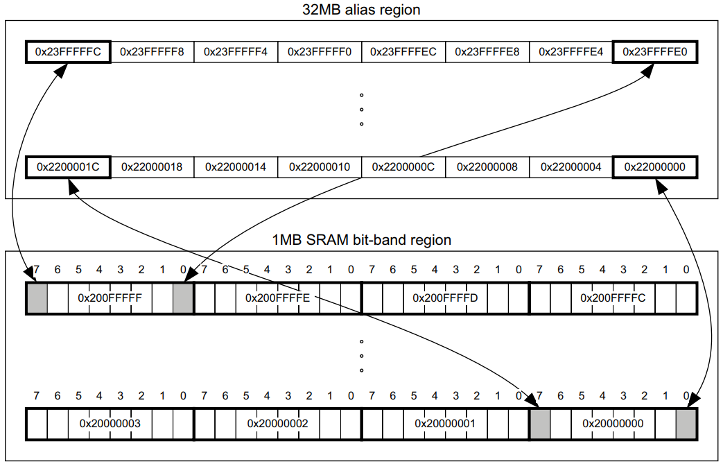 AliasAddr = 0x22000000 + ((A‐0x20000000)*8+n)*4 =0x22000000 + (A‐0x20000000)*32 + n*4