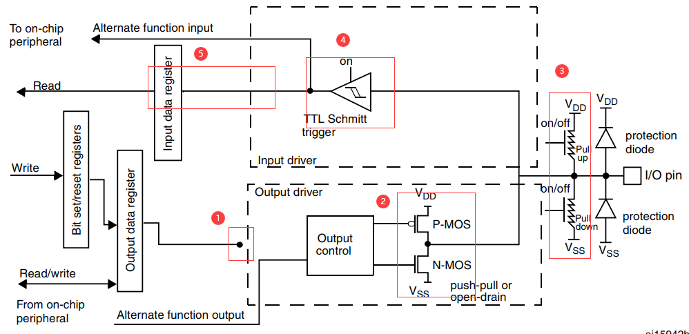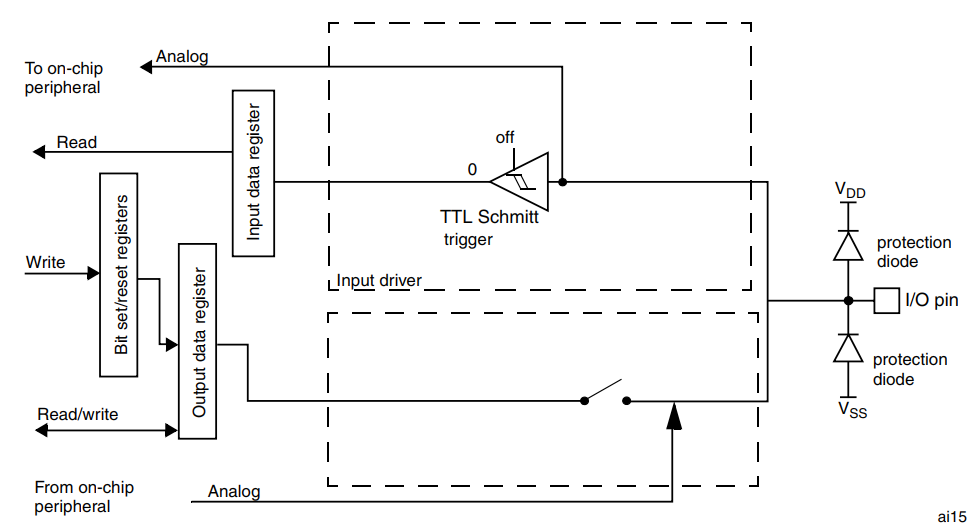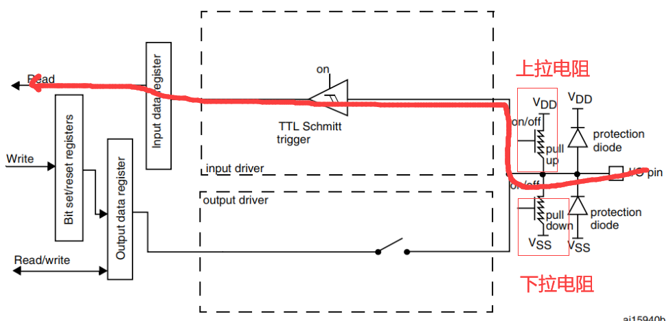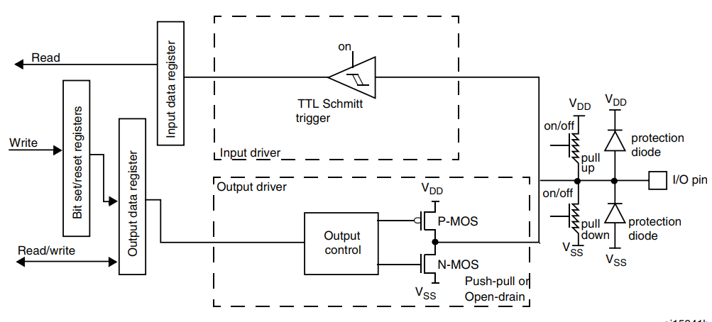 1、在普通输出模式中,TTL施密特触发器是打开的,所以读输入数据寄存器,可以得到 I/O 的状态。