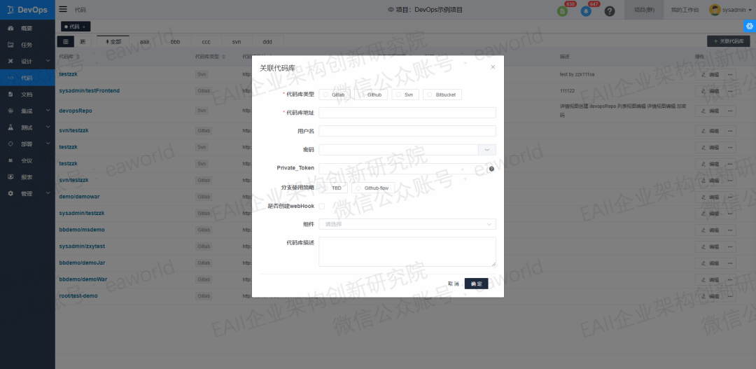 下图是将第三方代码库关联至DevOps项目中去需要配置的表单界面