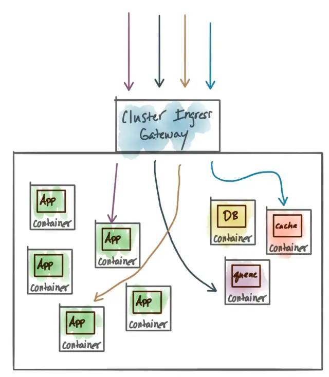 在这个级别上,我们可能希望某种“ingress网关”成为允许请求和消息进入群集的流量哨兵。在这个级别上,您的思考更多是“我的集群中有此服务,我需要集群外的人能够调用它”。