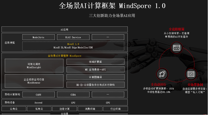 此外,华为正式发布了端边云全场景的AI计算框架MindSpore 1.0:支持模型、算子及硬件处理单元级全自动并行;对端边云设备如手机、摄像机、服务器等全场景自适配;开发流程极简,开发者可基于MindSpore快速实现模型导入、灵活调试。