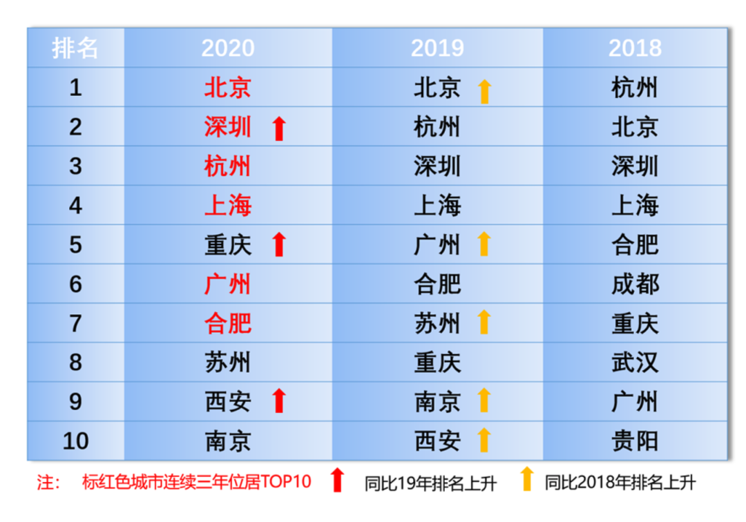 报告中发布的2020年中国人工智能算力城市排行榜,排名前五的城市依次为北京、深圳、杭州、上海、重庆,排名6-10的城市为广州、合肥、苏州、西安、南京。