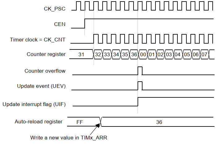 The content of the preload register are transferred into theshadowregister permanently or at each update event (UEV), depending on theauto-reloadpreload enable bit (ARPE) in TIMx_CR1 register.