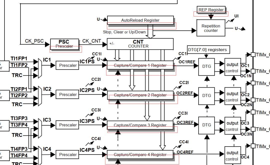 在定时器框图中,有个小细节,有些寄存器下有个阴影