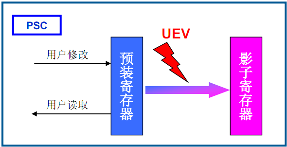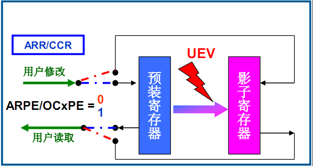 根据控制位,在发生U事件后,预装载寄存器内容转移到有效寄存器。这也就是对影子寄存器的说明。
