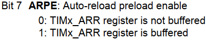 ARPE=0,当ARR值被修改时,同时马上更新影子寄存器的值;