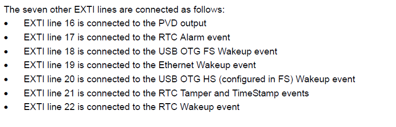 EXTI是外部中断吧,上面的主要是针对的这22条中断线的说明,我们还知道还是有很多中断的,比如定时器中断,串口中断等等,他们不属于这22条中断线。