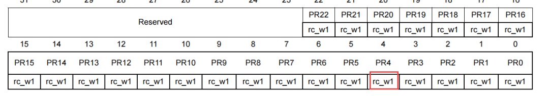 32位寄存器,每个位控制一个中断的失能。STM32F10x只有60个可屏蔽中断,所以只使用了其中的ICER[0]和ICER[1]。